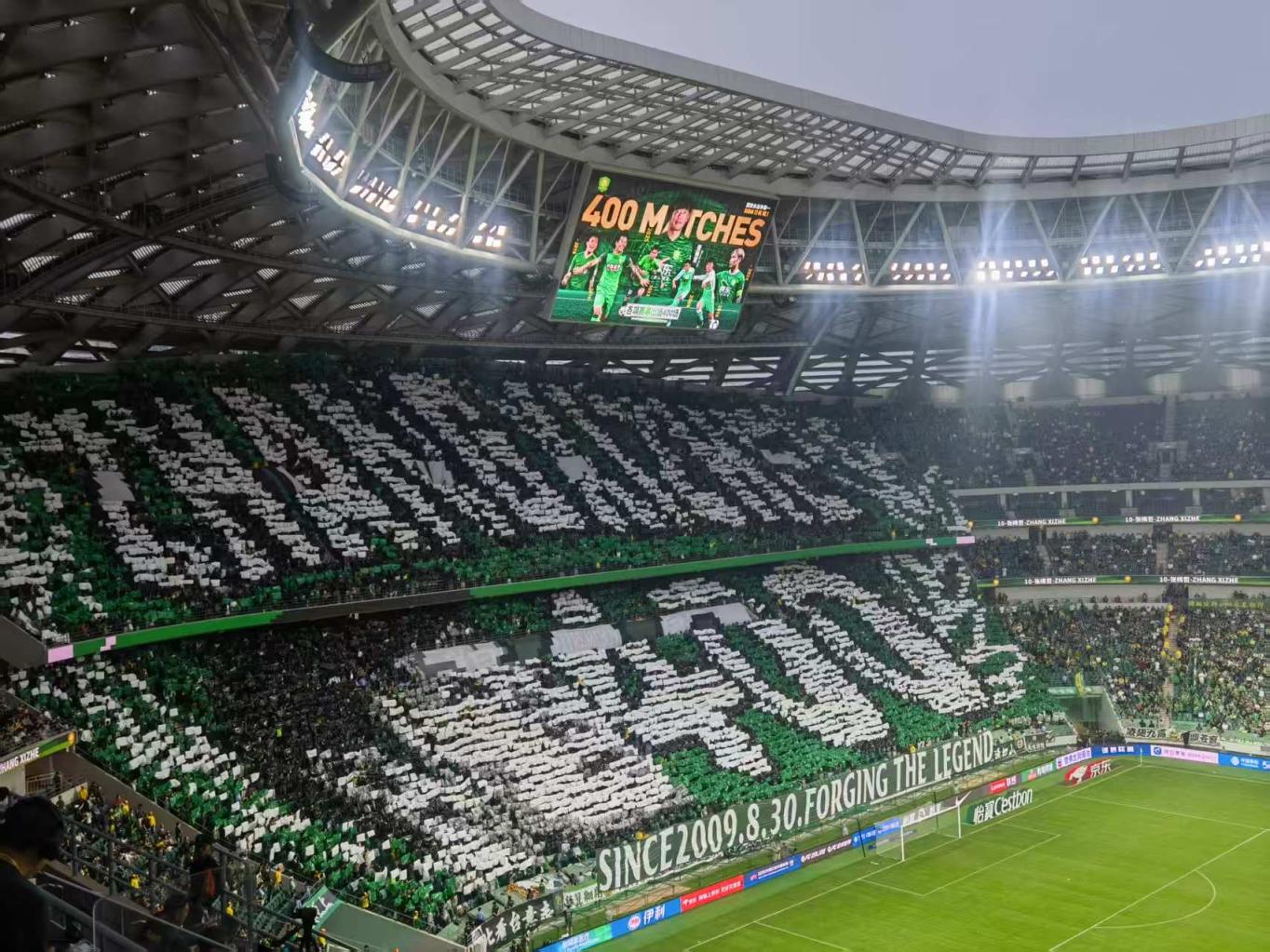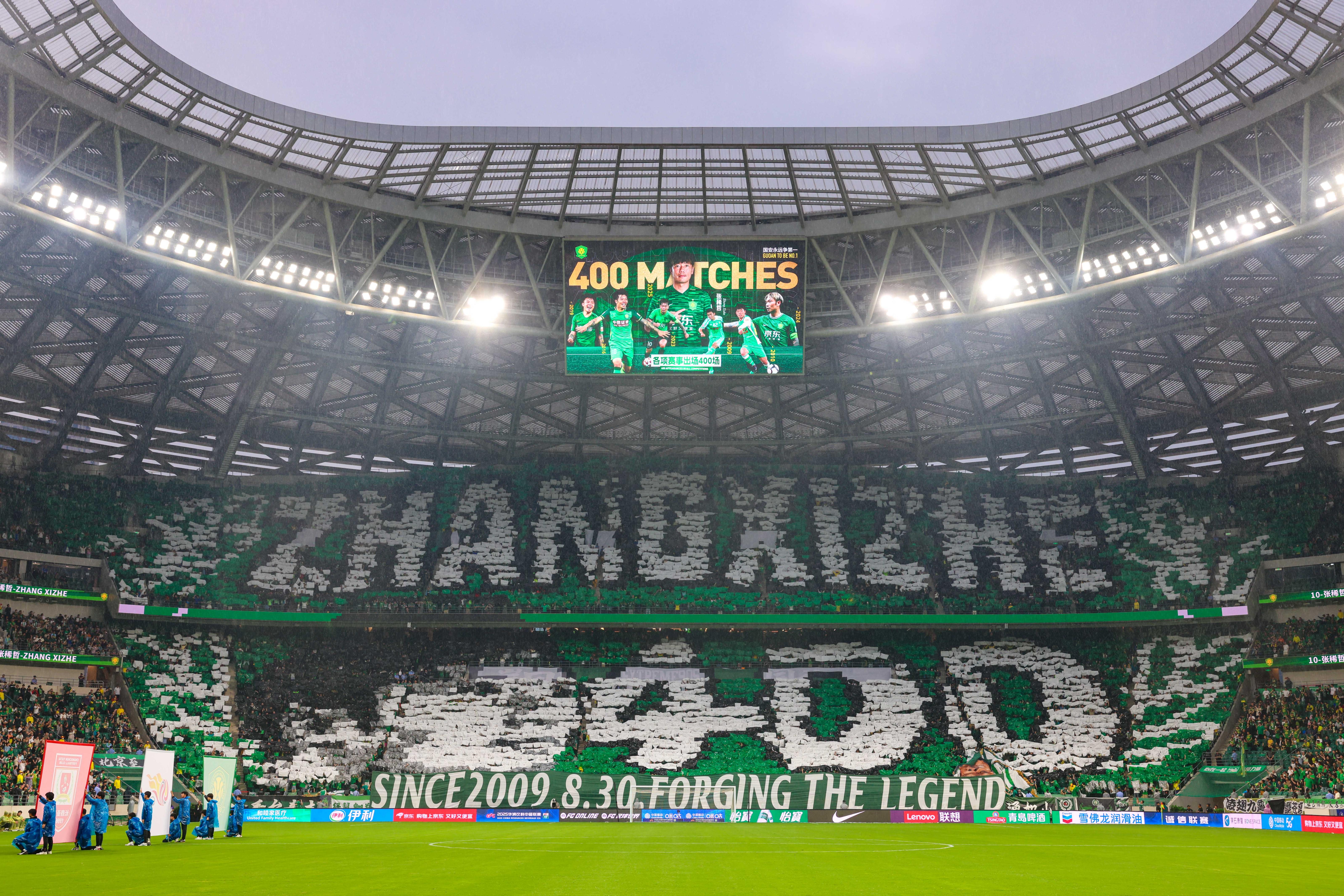 此后,球迷们共同展示出为纪念34岁的老将张稀哲国安俱乐部出战各项赛事400场的专属拼图,这套拼图覆盖了整个北看台。其中,上层为张稀哲的拼音名,下层左侧为张稀哲的侧脸头像,右侧为400场的数字,看台下方还有“从2009年8月30日,锻造为传奇”的英文口号。这是为了标注张稀哲在18岁时首次代表国安俱乐部出战中超联赛的日期。