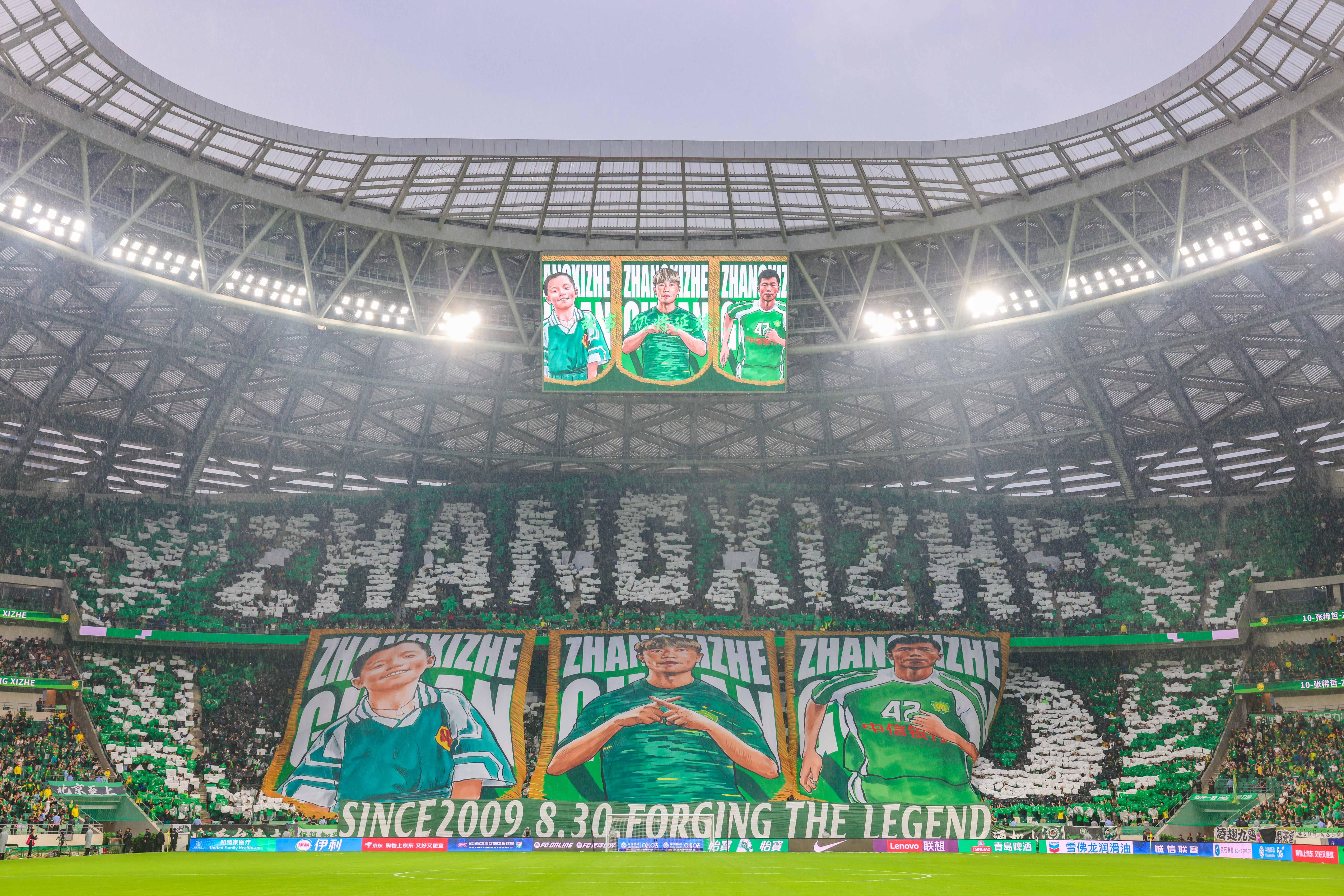 6月14日晚,北京国安队主场迎战长春亚泰。比赛开始前,球迷组织御林军精心设计准备的巨型TIFO在工人体育场露出真容。这是新赛季国安球迷在工体打出的首张TIFO,献给了国安34岁的老队长——张稀哲。